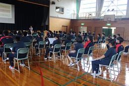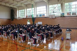 2年生は、職場体験学習のオリエンテーションを体育館で行いました。